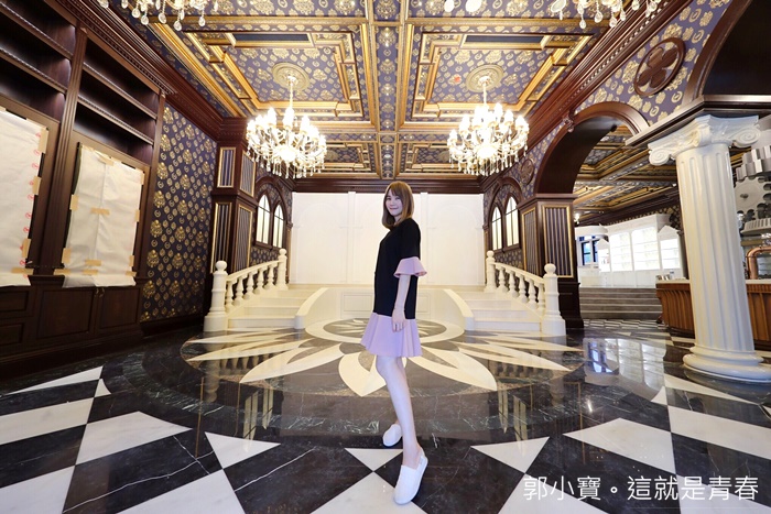 後方繼續走去才發現內部空間也超大的,後方一整個就是讓人少女心爆發的地方,白色的櫥櫃跟超美的大吊燈,金碧輝煌的天花板搭配黑白相間的方格地板,好美! |