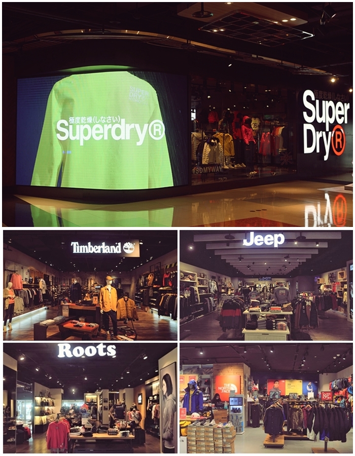 SUPER DRY整個櫃位超大,頗有旗艦店的氣勢,外牆還有圓弧形的電視牆,真的展現了氣派的店頭櫃氣勢,我個人會逛的快時尚品牌櫃幾乎都集中在這邊,這樣逛街購物起來方便許多,目前全桃園最大的旗艦店就在大江購物中心。