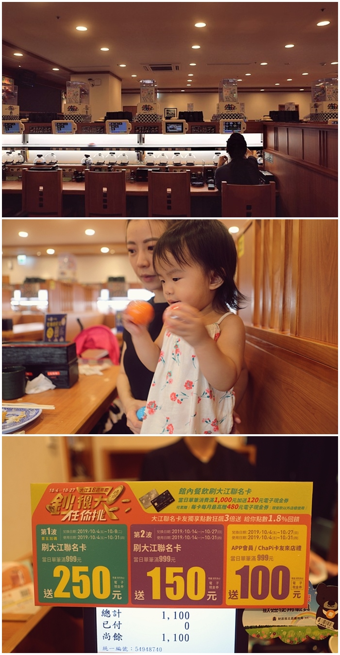 我們一家人真的玩了一整天,從早到晚一整個都在大江購物中心度過,所以晚餐就直接在大江的くら寿司 藏壽司用餐,連餐飲也都一起加入了慶賀大江購物中心週年慶的陣容,當天我們吃了20盤德到三顆彩蛋禮物,一整個就是超幸運的。