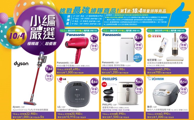 先趕緊跟大家分享一下小編嚴選的部分,這次家電區的部分真的殺很大,幾乎天天都有小編嚴選商品下殺折扣,而且都是當紅炸子雞的家電商品,也難怪可以引起那麼多的排隊人潮,真的非常瘋狂,所以有興趣的朋友真的要好好的研究一下這次大江購物中心的週年慶攻略,很多必敗商品都在電子DM內的小編嚴選!!