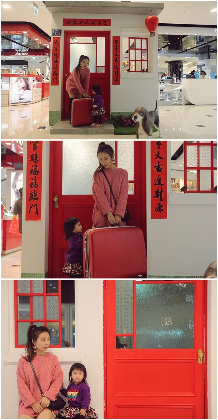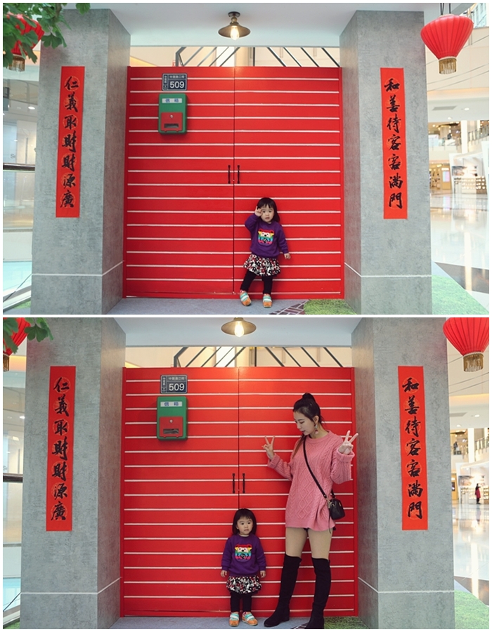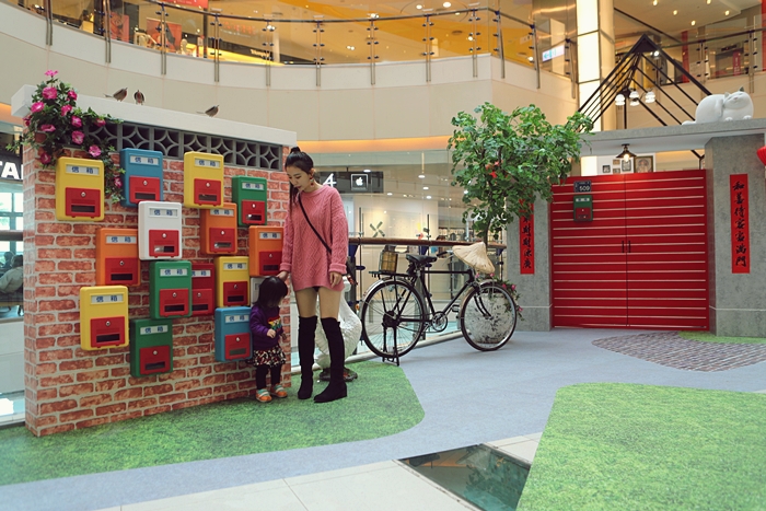 整個藝術裝遍佈大江購物中心,不管走到哪個角落都可以發現她們的用心,一樓大廳後面還有一個超懷舊的眷村家門,外面的一咖行李箱似乎告訴每個游子過年就該回家團圓,真的很好拍,不管是網美照還是家庭照都讓人回到了50年代。