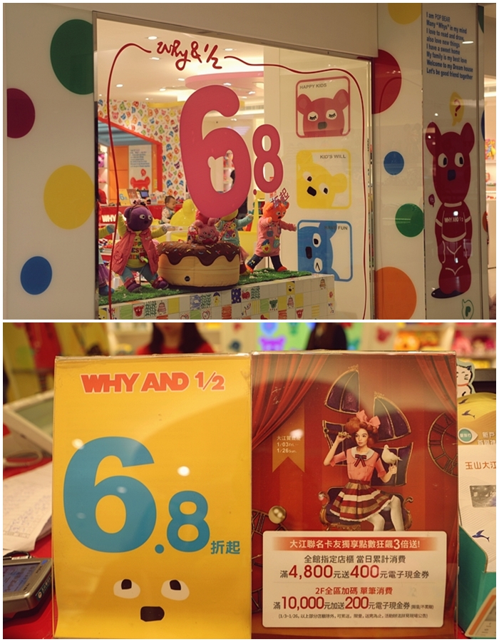 | WHY AND 1/2的商品幾乎都有6.8折起非常划算,我每次來大江購物中心都會看到WHY AND 1/2舉辦特價活動,且下殺的幅度都很大,這也是我們家為什麼喜歡來大江購物中心逛街採購的主因之一。 |