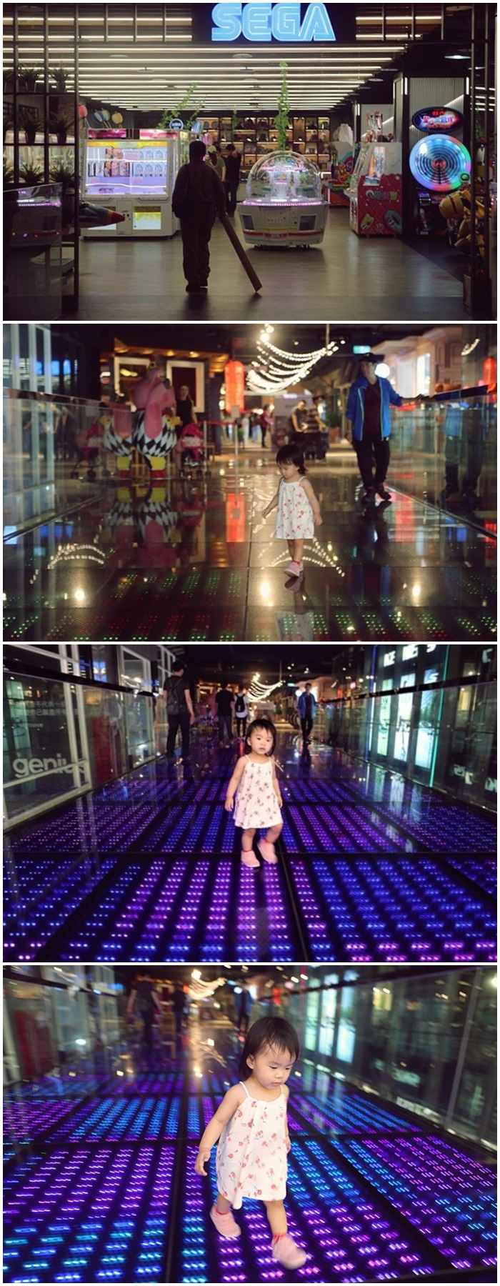 | 銜接娛樂遊戲區通道打造未來感之玻璃空橋,結合不定期變換顏色與頻率之LED燈光,打造新穎、潮流氛圍,一次輪迴大約是5分鐘的時間,潮流感真的超重的,羨慕的燈光搭配空橋讓人彷彿來到不一樣的空間裡,我們家小Cola一整個在上面跑個不停。 |