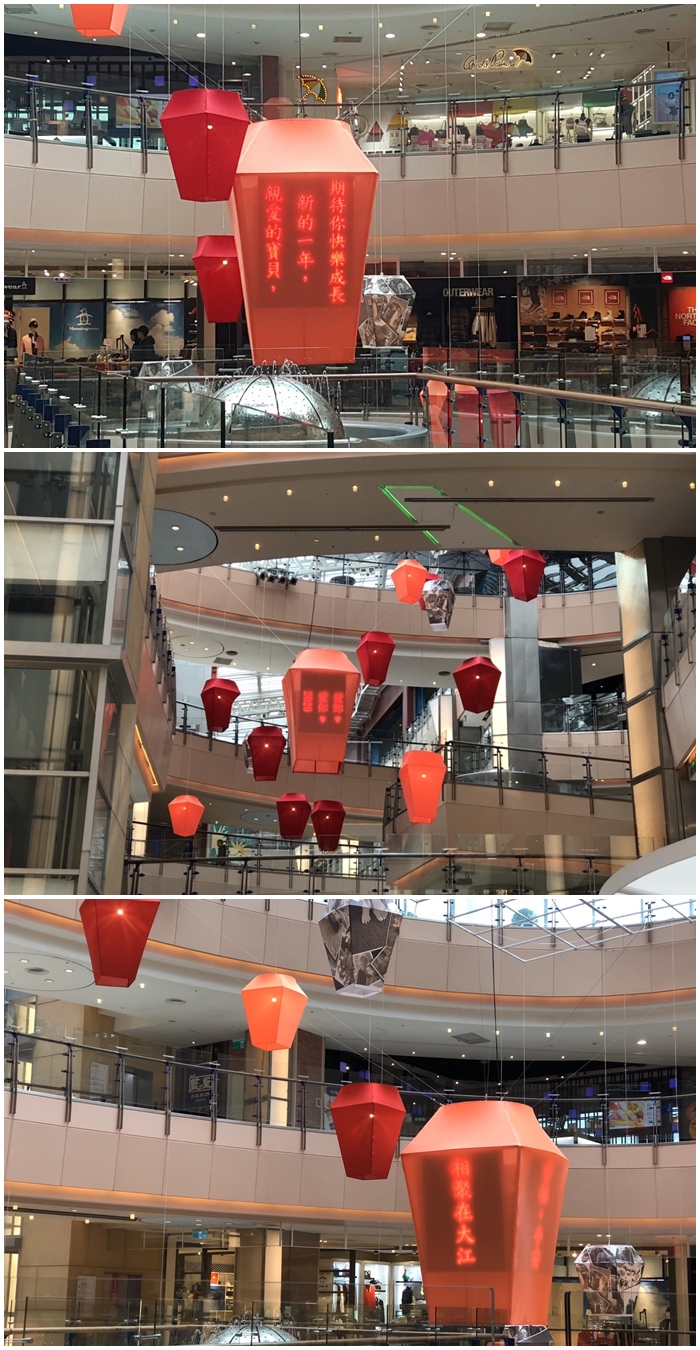 整個中央廣場天空都掛滿了天燈,天燈會顯示出大家把明信片投入郵筒的新春祝詞通通放上來,彷彿一盞盞飄在天空的天燈真的美極了。 |