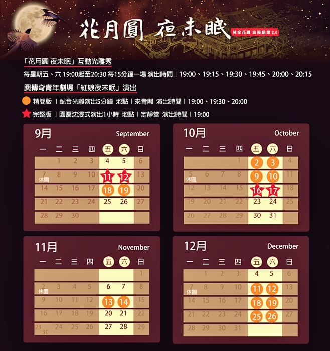 | 繼去年大受歡迎後,這次2020年推出全新2.0版林家花園夜間光雕秀,以「花月圓 夜未眠」為主題一路點燈到年底,新北市人可免費入場,每個周末都可以去享受這藝術的放空饗宴。 |