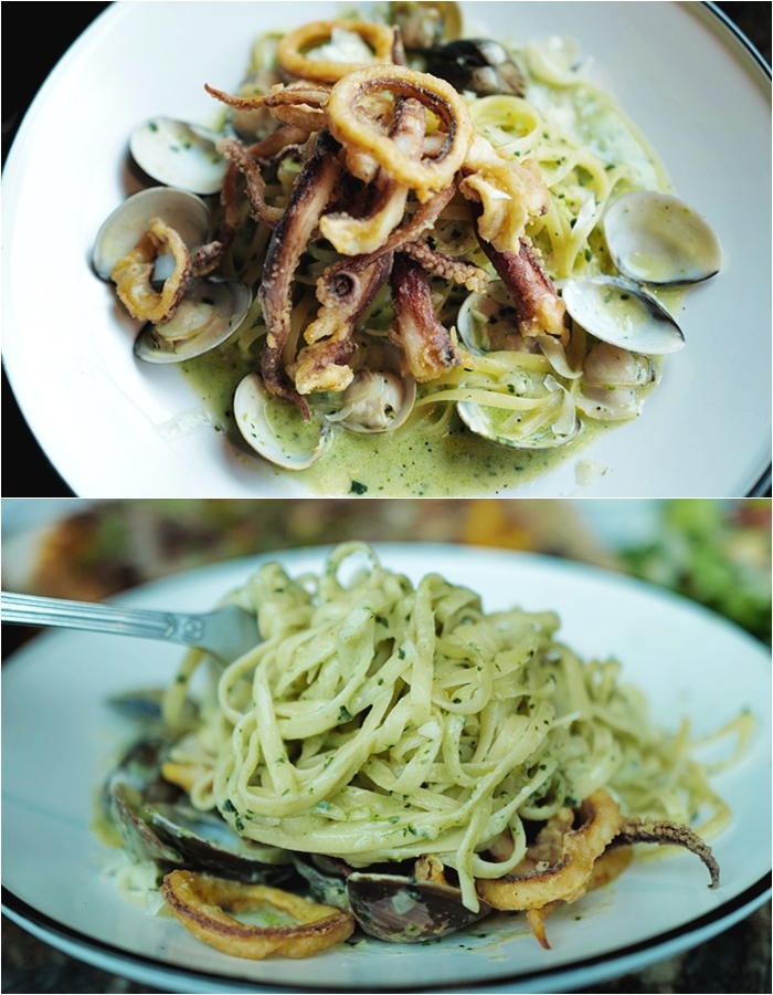 我超愛他們家的青醬寬扁麵,青醬的味道緊緊的巴在寬麵上,我女兒也很喜歡古拉爵的青醬寬扁麵,搭配炸過的透抽圈更添口感,蛤的數量也不少。 |