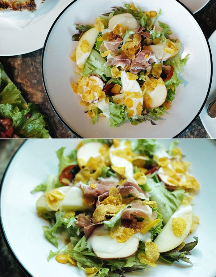 素蘭諾火腿生菜盤裡面還有玉米餅跟蘋果,搭配生菜、火腿一起入口的層次非常豐富,火腿的滋味很濃郁,這一道讓人胃口大開。 |