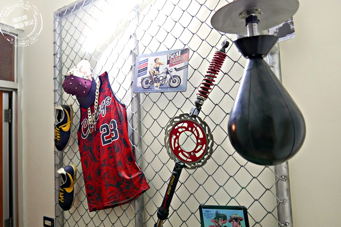 | 樓梯上來這些健身設施,佈置起來還蠻有味道的,很像學校裡籃球場外的圍牆,掛在這牆壁做裝飾,加上球衣,會讓人心裡不由自主的熱血了起來,這就是青春呀。 |