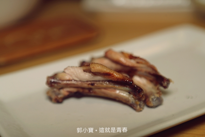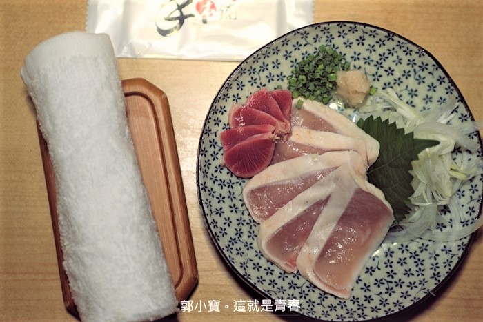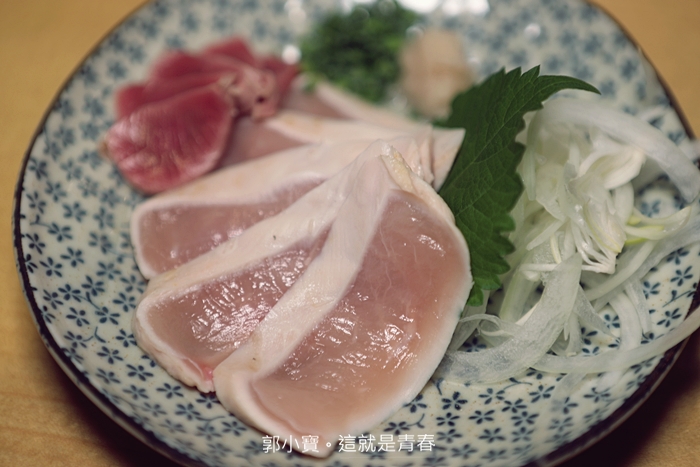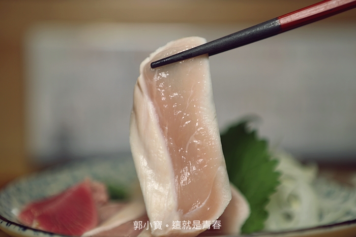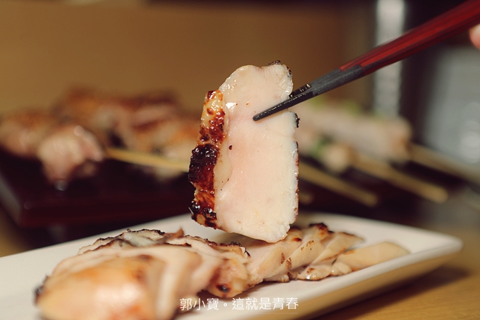 | 如果妳沒辦法接受極品的生雞肉料理,那建議你一定要試試看它們的招牌之一的雞胸一夜干,跟製作鮮魚的一夜干相同,但多了一道浸泡燒酒的手續,烤至7分熟,吃起來有點像是熟成後的雞肉帶點淡淡酒香,口感也非常的軟嫩。 |