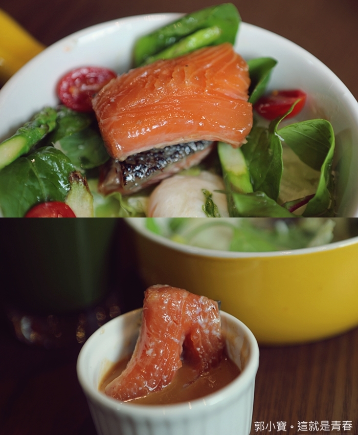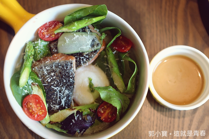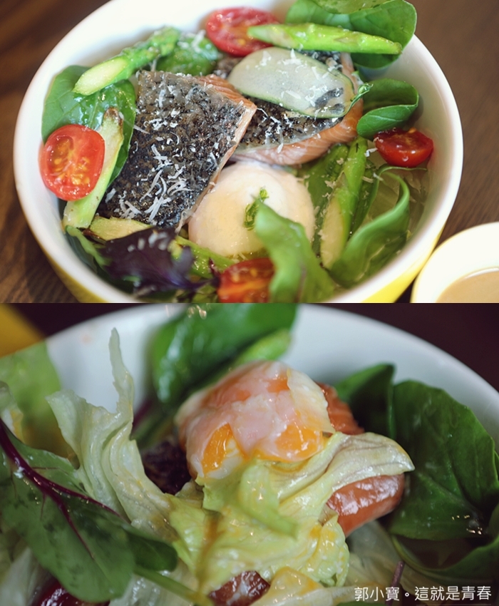 | 這沙拉送上來的時候我真的還滿佩服這一家餐廳的,不管是湯品還是沙拉真的都有讓我眼睛為之一亮的感受,這醃製熟成的鮭魚也真的很特別,給的沙拉蔬菜非常多,還有一顆半熟蛋在中間,半開蛋黃一起吃更美味。 |