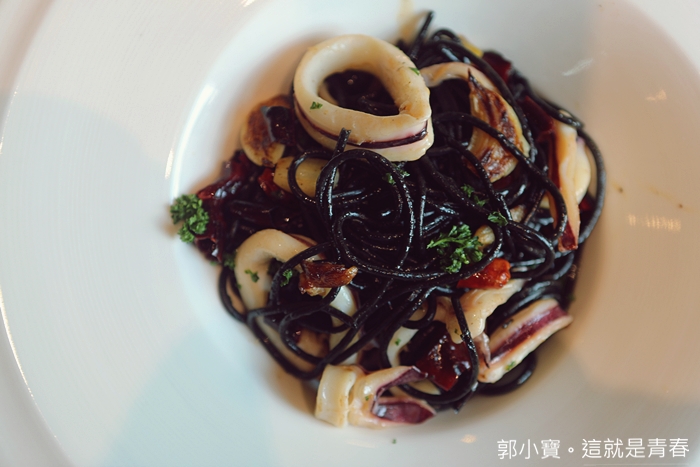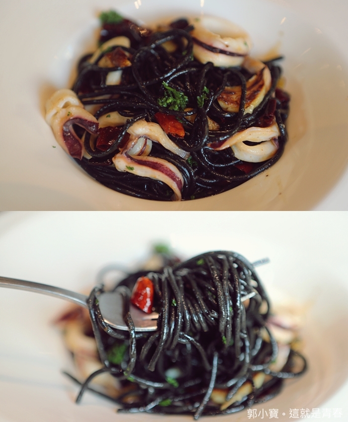| 非常正統的義大利麵,收汁收的很乾但吃起來麵條是濕潤的,咀嚼可以吃到小麥的香氣跟墨魚的濃郁,帶點辣度非常開胃,花枝圈非常彈牙,很好吃,這價位真的很划算! |