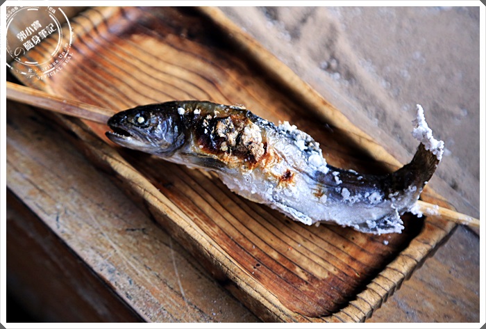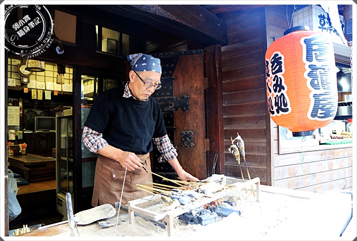 | 草津溫泉很多日本人推薦的烤海鮮,老爺爺相當的親切,每一串都是700日幣,香魚跟蝦子都很好吃,尤其蝦子肉超彈牙的! |