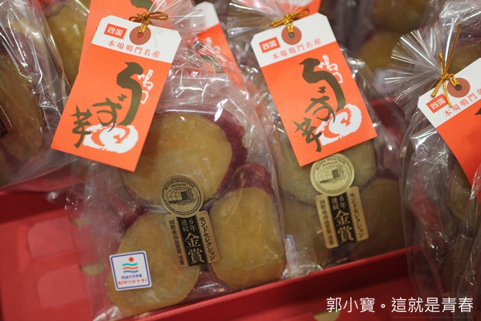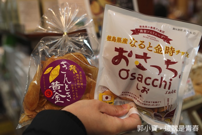 德島在地土產第一名就是鳴門金時,也就是在地的地瓜土產,新鮮地瓜想要帶回台灣又重又不容易,當地有很多鳴門金時的加工商品及零食,但是想要品嘗到真正鳴門金時的滋味就是要買這個新鮮切片地瓜,我這次吃了滿多鳴門金時製作出來的加工品,但是我還是最推薦這個可以吃到纖維的地瓜切片,用糖蜜醃製的工法在台灣也很常看到,重點是可以享受到鳴門金時地瓜本人的口感XDDDDD