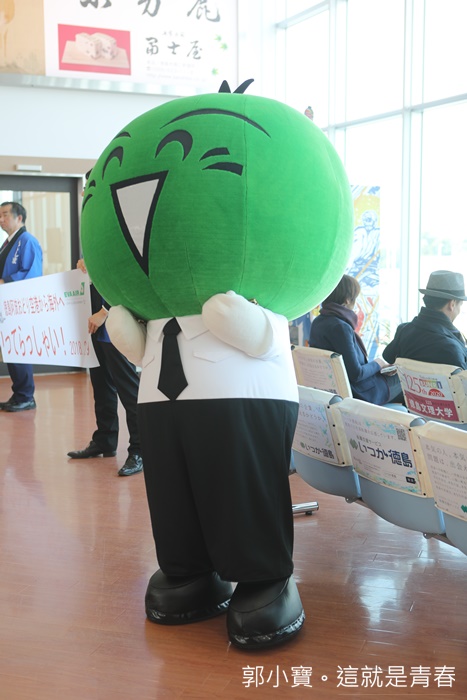 | 德島縣的吉祥物酸橘君也到機場迎接大家,酸橘軍也是日本眾所皆知的熱門吉祥物,換上機長的制服真的好可愛,而且很熱情的跟每個來到德島的台灣旅客拍照。 |  |
