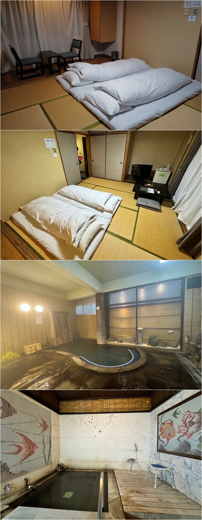 | 第二晚入住的飯就在竹瓦溫泉旁邊,老式的日式旅館是屬於塌塌米房,擁有大浴池跟單間溫泉,溫泉泡起來相當舒服,早餐也很豐富。 |