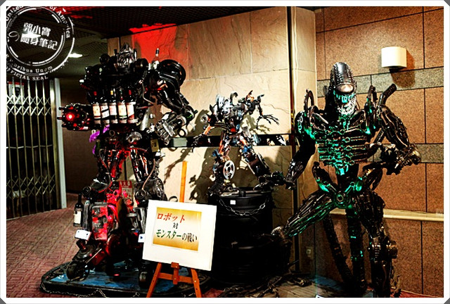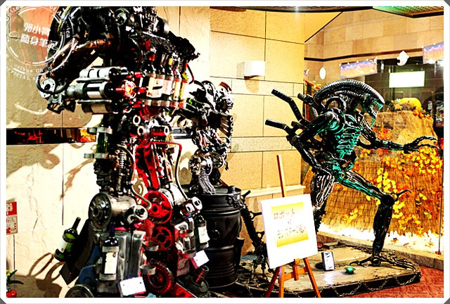 | 高原飯店的大廳真的是很大,裡面也有很多裝飾物,利用汽車零件拼裝出來的異形跟機器人。 |