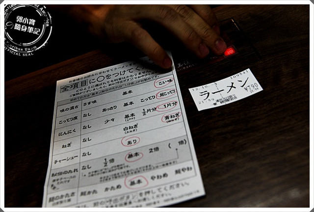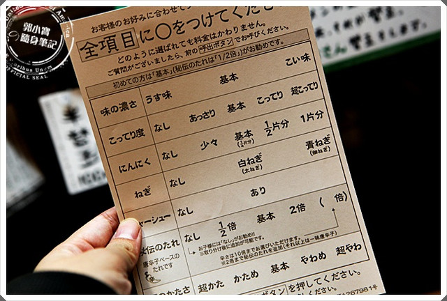 | 這不是菜單,而是讓你勾選濃度、辣度、紅白丸、麵的軟硬度等等選項,
