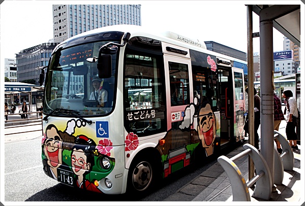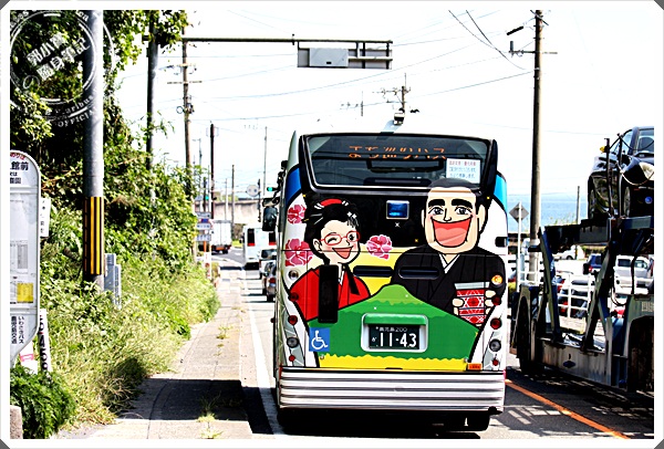 車子非常的好認,就是貼滿彩圖的小巴士,車子很新且有Q版的篤姬在車身上,非常的好認,
