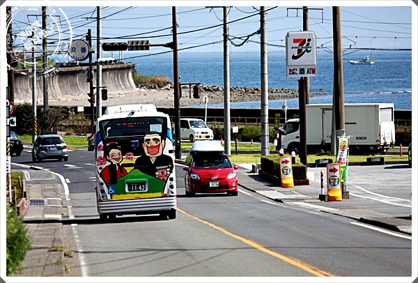 磯岸這附近的名勝古蹟頗多,延著海岸道路走下去就可以到達仙巖園,也千萬別忘記去品嘗名物兩棒餅, 這樣的天氣下走在日本海岸旁,是一件很愉悅的事,感受著濃濃日式風味,這附近就有兩三個景點了, 所以不用再等觀光巴士了,步行五分鐘內就可以到達各個景點,看著巴士遠走的感覺,很有夏日電影的FU~