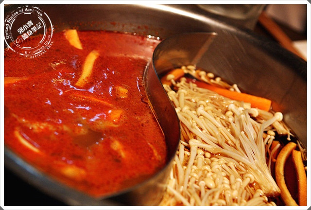 日本的壽喜燒是有鴛鴦鍋的,可是那紅咚咚的一邊不是麻辣鍋唷!! 那是香料鍋,跟麻辣一點關係都沒有,湯汁一樣淺淺的