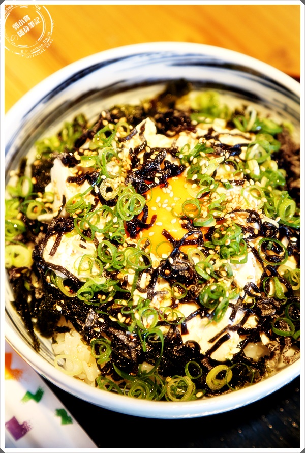 除了鋪滿整碗飯的豆腐以外,也灑下了大量的細蔥跟烤海苔。