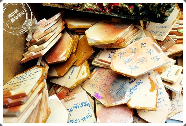 | 一旁建造中的小塔,可以看到很多瓦片上面均有信徒均贈的瓦片,