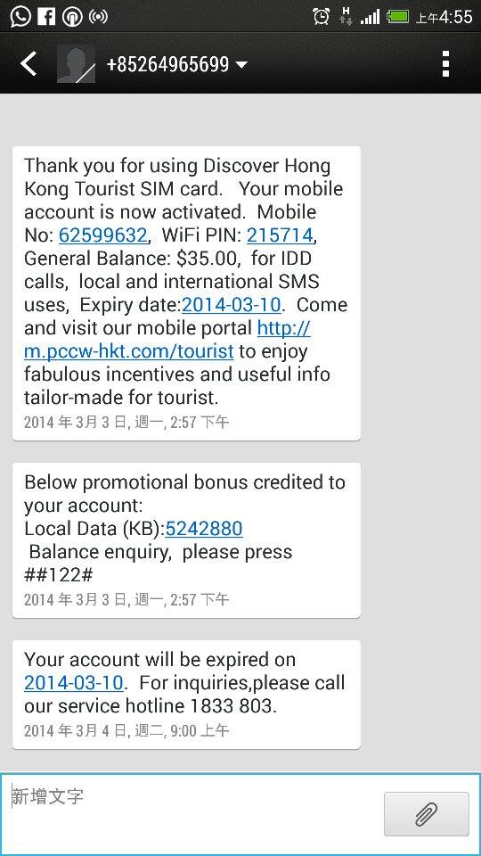 等大約3分鐘內,電信公司就會把簡訊發送過來,那時候就有網路了。