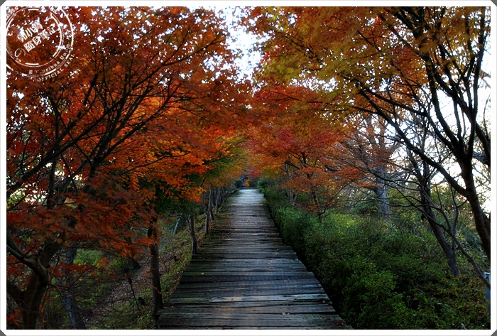 木板鋪成長長的步道,兩逼的紅葉交雜的癖黃的嫩芽,真的是美到了頂點。