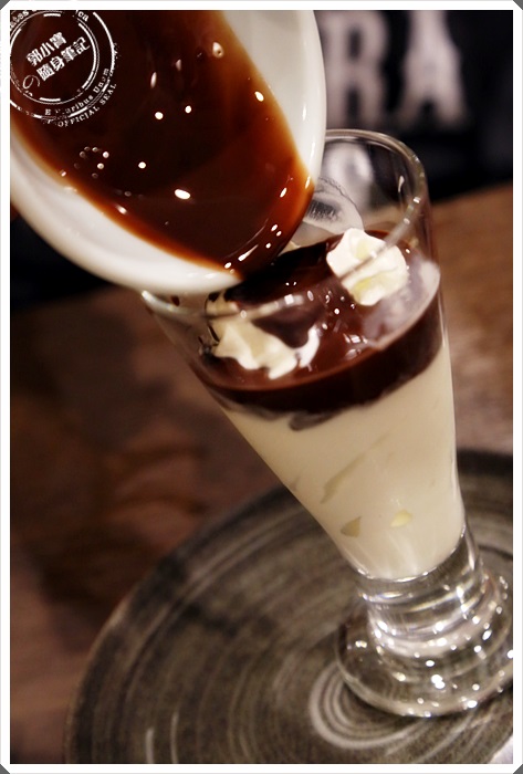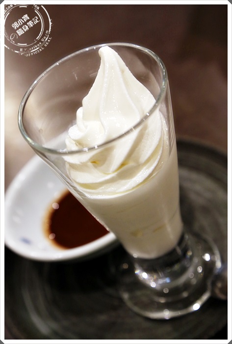 | 甜點每個人只能選擇一種,只能一次而以唷,所以要好好的選一下,我選的是巧克力牛奶冰淇淋,但是送上來的時候還滿有趣的,牛奶冰淇淋杯跟巧克力是分開的,要自己把巧克力醬淋上去。 |