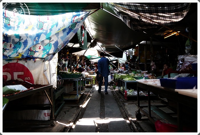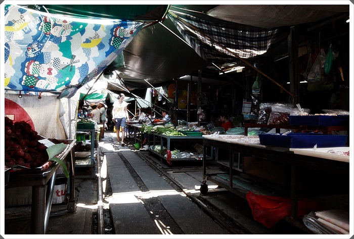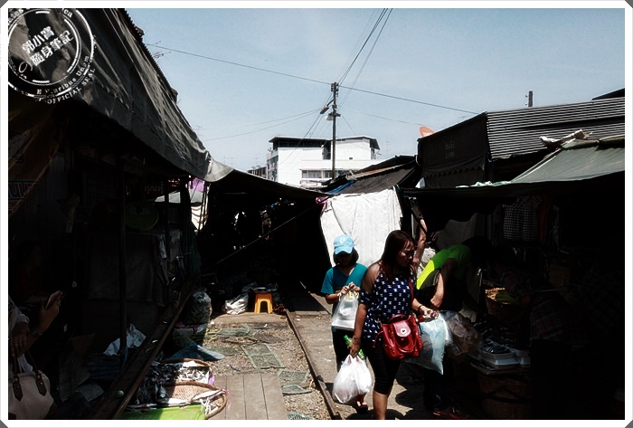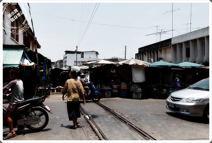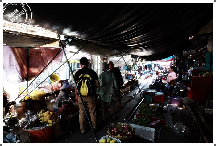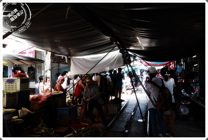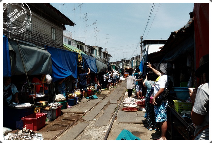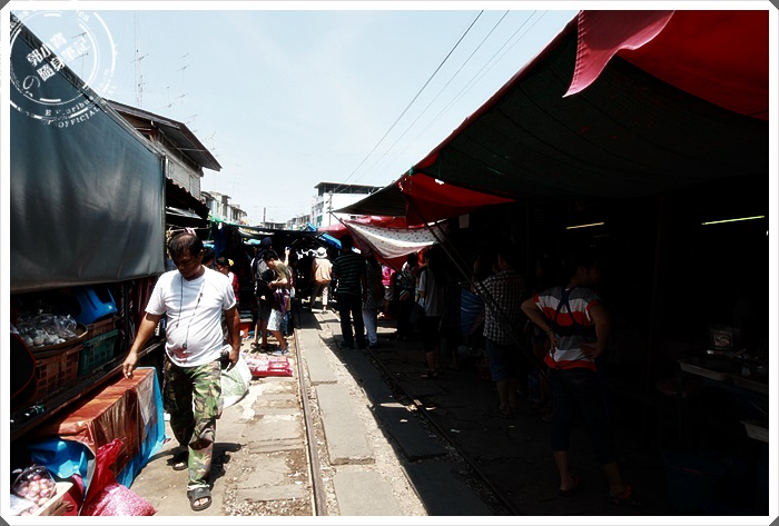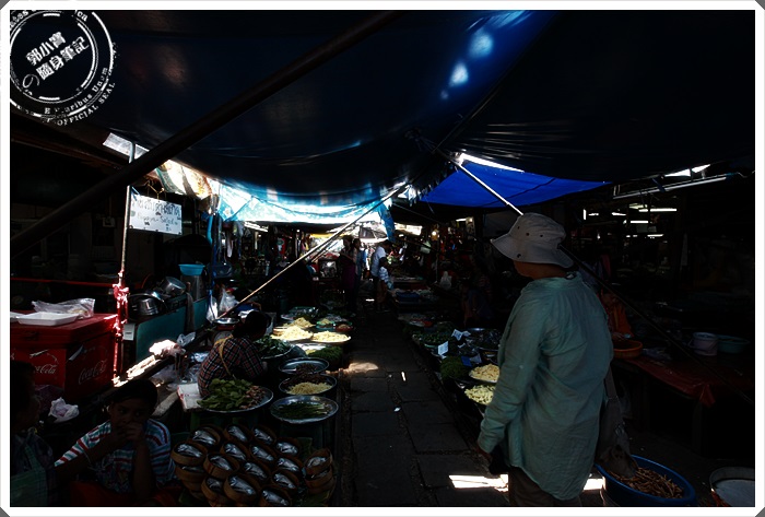 | 這個市場其實非常非常的大,就是很傳統的一個菜市場,而且不是一個參觀用的市場,是當地人本身就會來這邊逛了,在菜市場的外圍的部分,因為有攤販擺放在與鐵軌相接的地方,因而造成了這樣的奇觀,現在稿的外圍這一塊遊客比內圍還要熱鬧,也因為這邊的攤翻都是屬於外圍,沒有遮陽的鐵皮或是屋頂,所以沿著鐵軌的地方都是有遮陽傘,走在鐵路上逛菜市場的感覺還滿奇妙的,理面販售的產品都相當的生活化,都是泰國人平常生活的食材與香料,在這邊幾乎沒看到針對觀光客販售的東西,當然這樣子走下來也收穫很多,包跨沿路上的氣味真的還不是普通的重,說穿了就是熟悉的菜市場味,但因為泰國的醃漬物更多,所以味道大概又重了幾倍,雖然攤販們都有立起遮陽傘阻擋陽光的照射,但是走在裡面還是可以從空氣中感覺到泰國的悶熱。 |