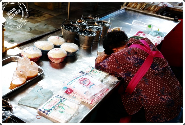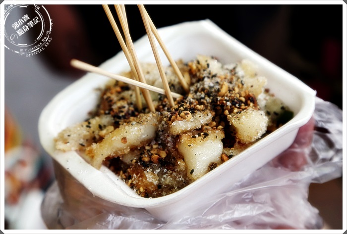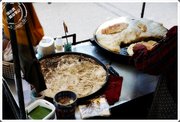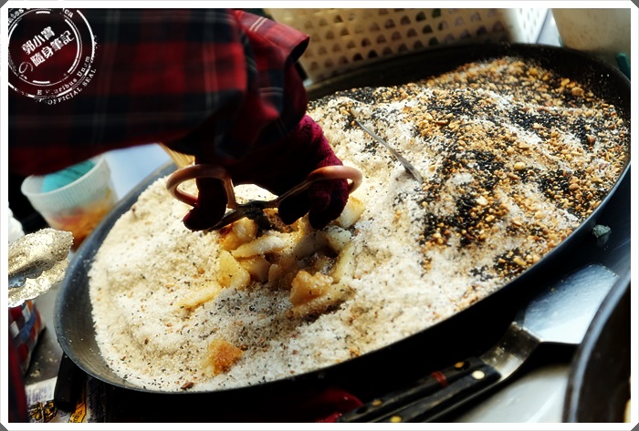 | 這小吃我們也沒看過,看起來非常像是麻糬,有兩個大鐵盤,一邊煎著麻糬一邊炒著糖粉,將煎到外皮金黃的麻糬剪成一塊塊的,再放到糖粉這邊拌炒一下,灑上芝麻跟花生。 |