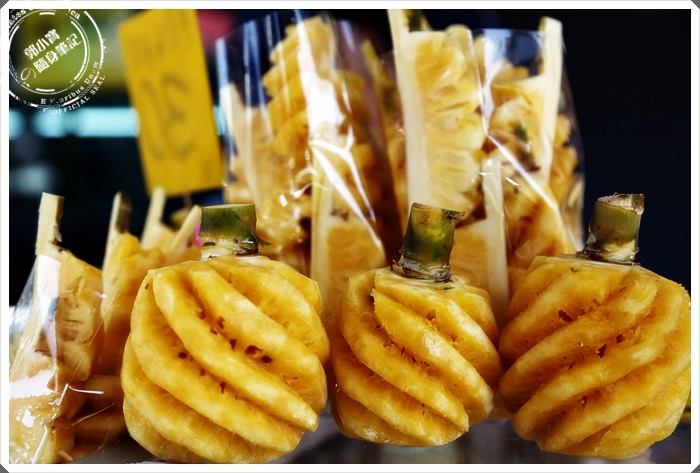 | 接下來馬上到隔壁的水果攤,泰國的鳳梨好甜美,這樣一顆只需要台幣30元,我覺得算是剛好的價錢,鳳梨小小的一顆很可愛,老闆娘切的方式也讓客人很好食用,完全不沾手。 |