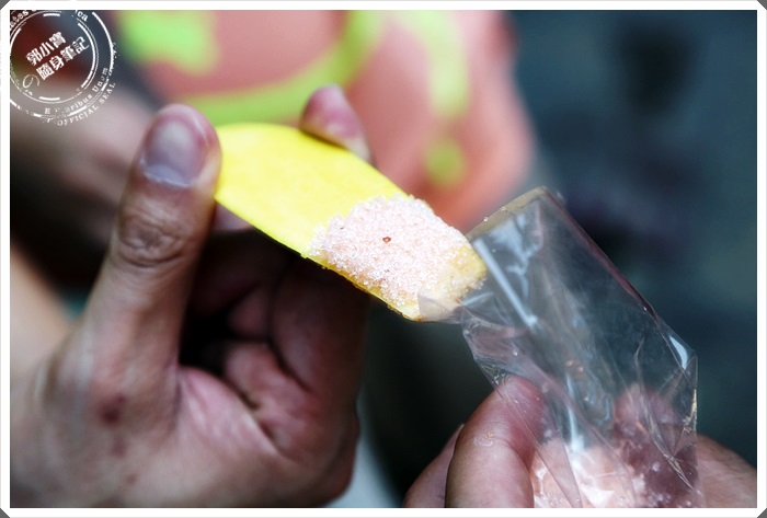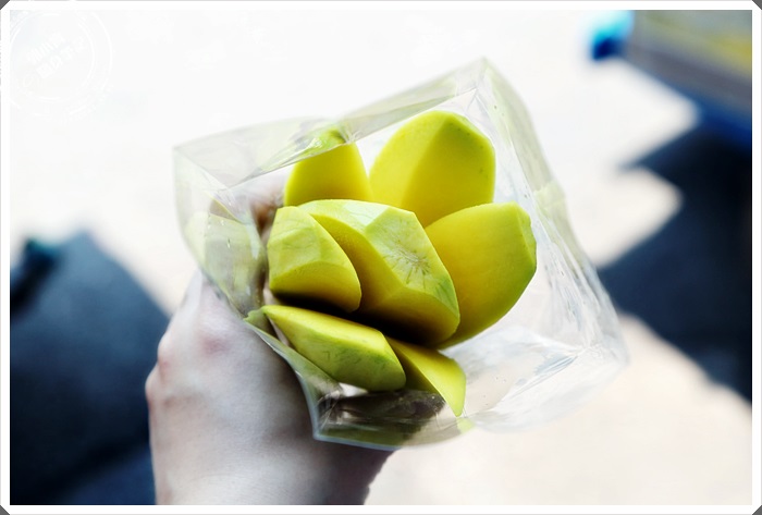 | 老闆娘看我們一群人拍東拍西又跟她聊天很久,然後就在我們挑戰隔壁攤的時候,又拿了一包這水果來請我們吃,哈哈!! 好熱情又可愛的老闆娘唷,送我們的這個似乎是青芒果的樣子,沾著糖粉一起吃,因為沒有水分吃起來有點乾,但是非常的脆口,但是整體來說還是鳳梨好吃,因為沒人捧場這青芒果,都是我一個人默默的把它嗑完。 |