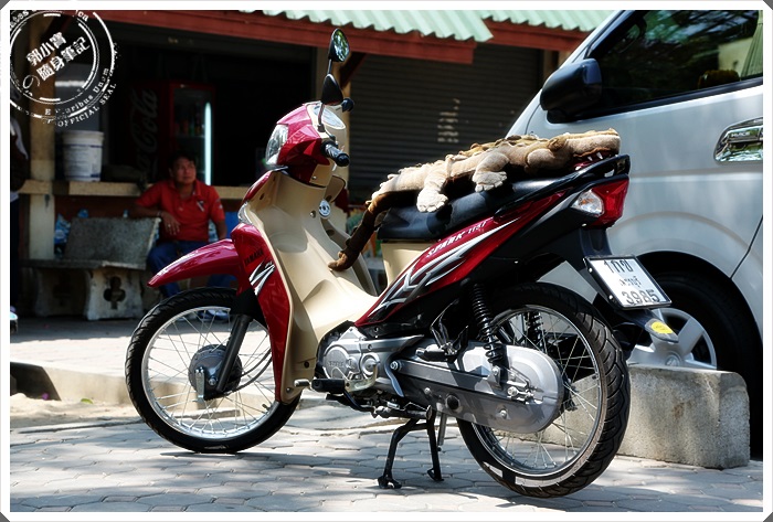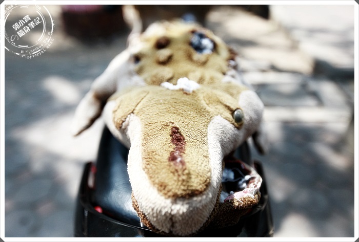 | 也因為這邊的猴子真的是太多了,所以這邊不管是汽車還是摩托車等等重要的交通工具或者商家,都要擺上一隻鱷魚玩偶,據說對恐嚇猴子非常的有用,當地居民說,因為以前這邊有鱷魚,鱷魚的時候就是猴子,所以猴子看到鱷魚就會逃走,演變到現在每個車子上面都會放上鱷魚的玩偶跟娃娃。 但是時間久了有一些猴子還是不怕死了,看看眼前的這隻鱷魚就應該被攻擊過了,一顆眼睛都不翼而飛了XD |