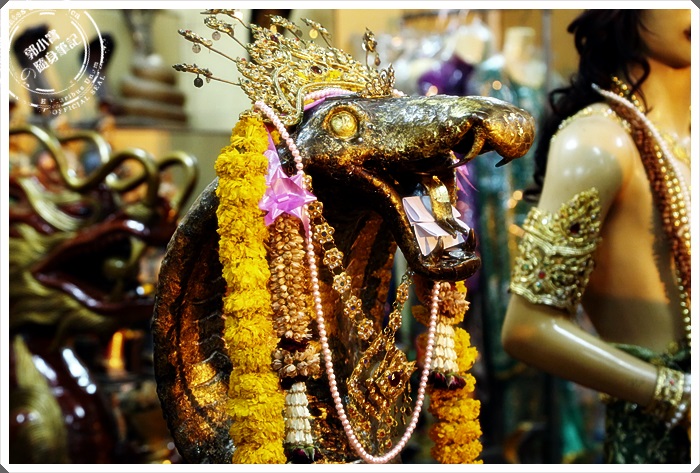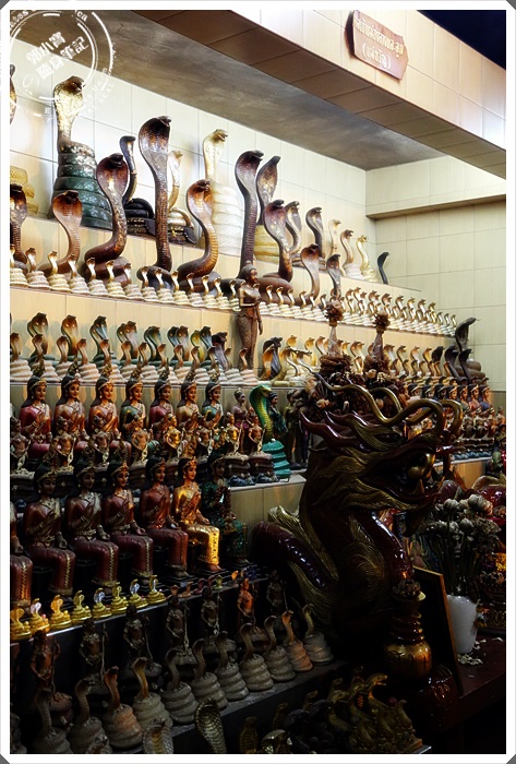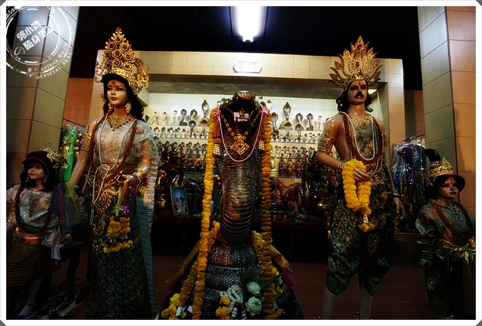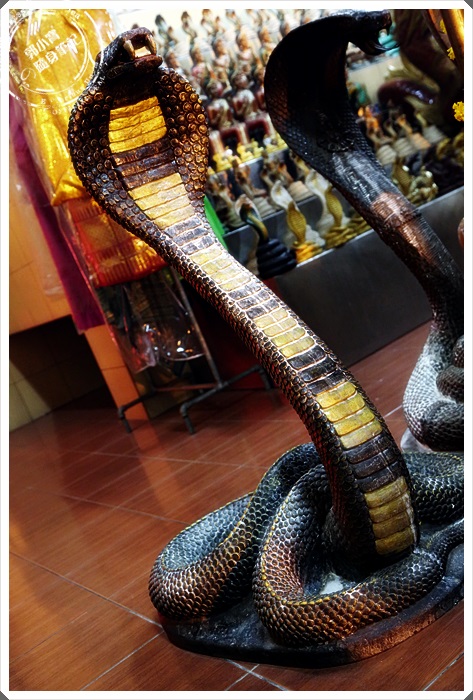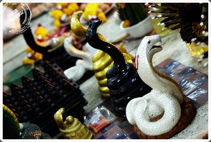 蛇廟的供俸大廳大概就是這個樣子,其實跟泰國其他的廟宇差滿多的,除了中間的四個人型神像以外,背後都是眼鏡蛇的靈蛇神像。