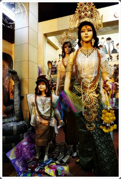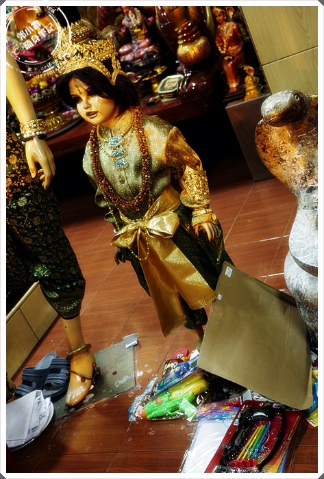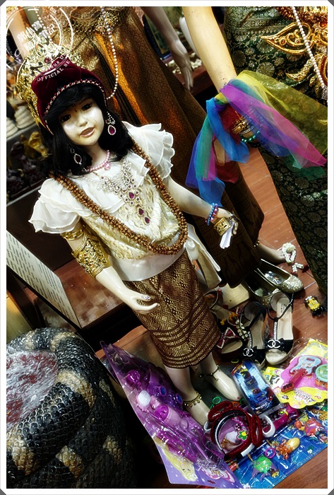 | 寺廟內放滿了大大小小的眼鏡神靈像,各種大小都讓人目不轉禁。這些靈像似乎都是信徒來還願打造的。除了小的靈蛇神像以外,還有一些以當初托夢的母眼鏡蛇的人型靈像。 |