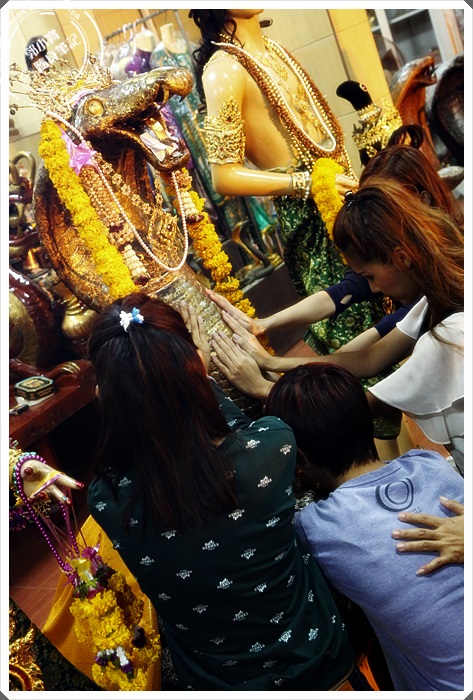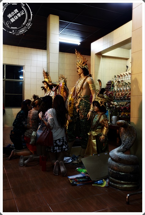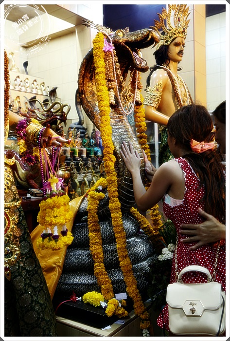 | 來這邊祭拜似乎都要摸一下靈蛇像一下,當天晚上看到的都是超級大正妹,有可能是因為晚上的關係,感覺來的信徒很多都是女性,以台灣來講的話大概就是酒店妹之類的,但是確實每個都超級正,中間一個似乎是媽媽桑的人帶著一票又一票的年輕女孩一直非常虔誠的膜拜著,在台灣的話大部分這樣的廟都稱之為陰廟。都是一些特種行業會來祭拜的居多。 |