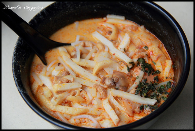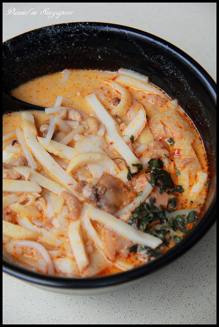 | 叻沙(SGD4.5),328加東叻沙的湯頭是以咖哩配上椰奶所熬煮而成,湯頭裡面還有麵條、海鮮等配料所製成,原來的馬來的飲食文化是沒有吃麵條,當華人飲食文化進駐到新馬地區之後才演變出如此特別的星馬小吃, |
