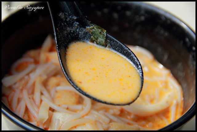| 雖然叻沙是星馬道地小吃,不過那湯頭的顏色看起來真是...不甚美味XD,所以本來沒抱持甚麼太大的期待,但是當我一喝下湯頭之後卻是完全改觀,叻沙的湯頭超濃郁,咖哩與椰奶的味道調配的恰到好處,而且應該還有加入在地香料,但也不會覺得很突兀,還加入了海鮮熬煮,所以帶點鮮味存在,這湯頭真的超讚, |