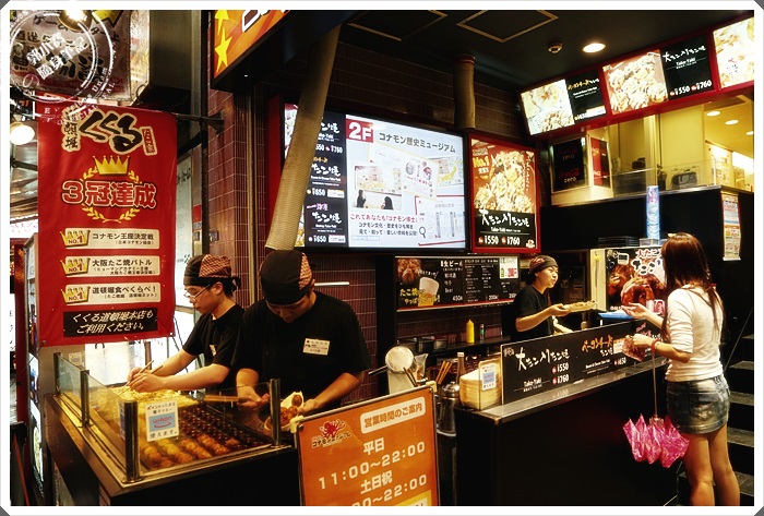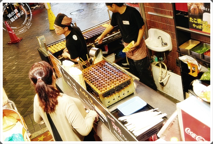 牆上布條掛著3冠達成好像很厲害的樣子,店員在門口拼命的煎著章魚燒,看起來就很讓人流口水。