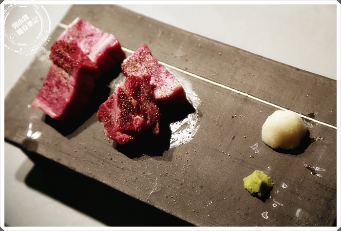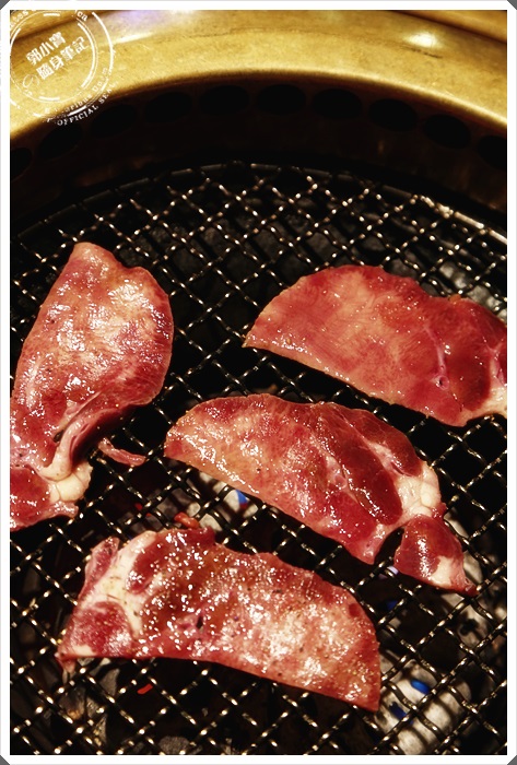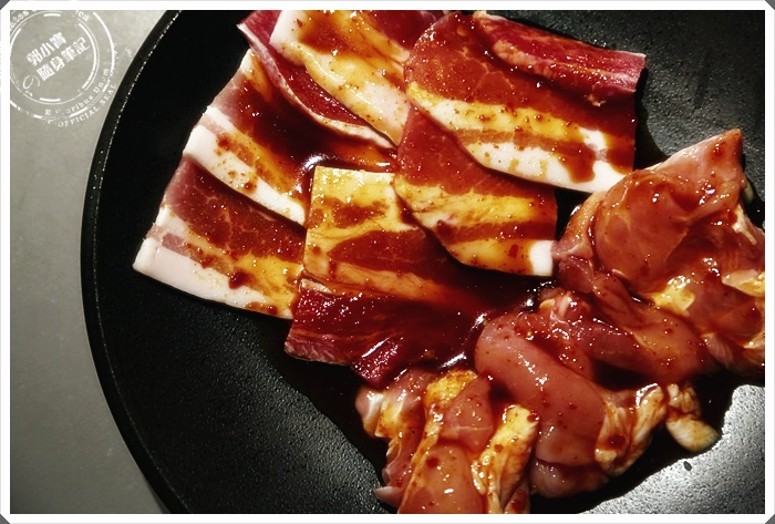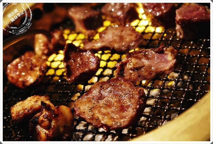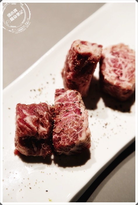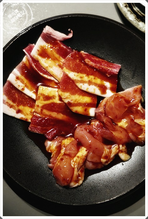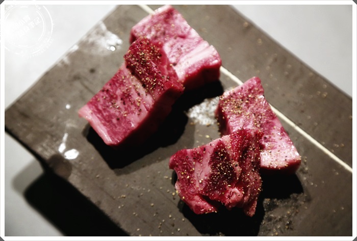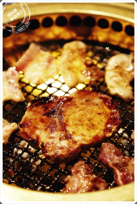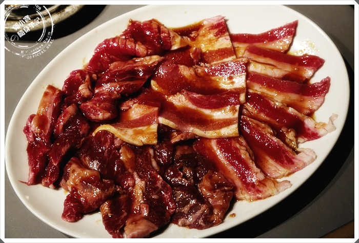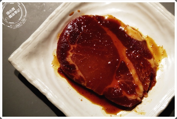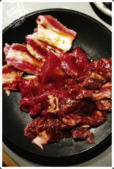 | 兩人套餐最好的肉大概就是這一份了,我也忘記這是哪個部位了,不過看它裝盤那麼的精緻,看了一下肉的油花跟感覺似乎不賴,稍微烤一下就可以夾起來了,吃起來超軟嫩的,肉汁相當的鮮甜,簡直是欲罷不能。 |