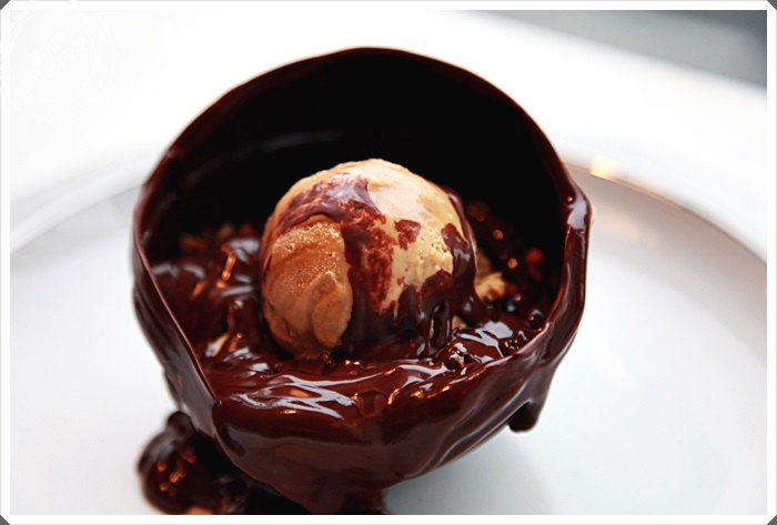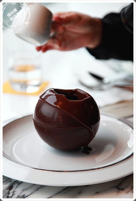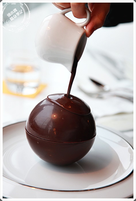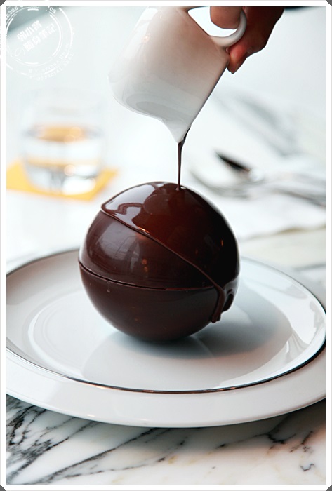 熱可可全數倒完後就會看到巧克力圓球沿著頂端開始慢慢的往四周融化,那景色的好融化,讓我看的是驚呼連連,這真的是一場華麗的甜點秀。