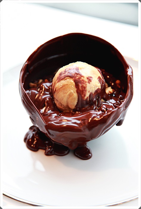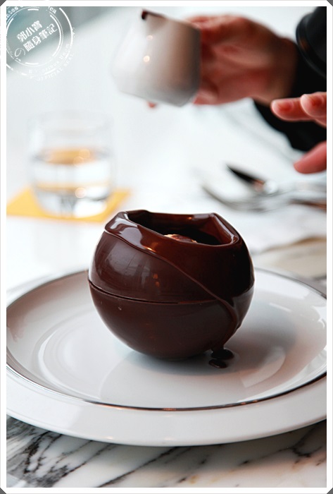 | 有機會來青山總店的話千萬別錯過點這一顆巧克力球,她不只美味而已,連過程都是相當的華麗且經過精心設計過,先上一顆看起來平淡無奇的巧克力球,接著工作人員會把手上一杯超燙的熱可可往求頂倒。 |