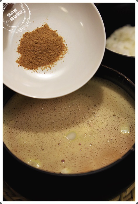 | 先把一起上桌的粉末倒入雞白湯裡面,雞白湯看起來很濃郁的樣子,一上桌這湯就散發出強烈的香氣了。 |