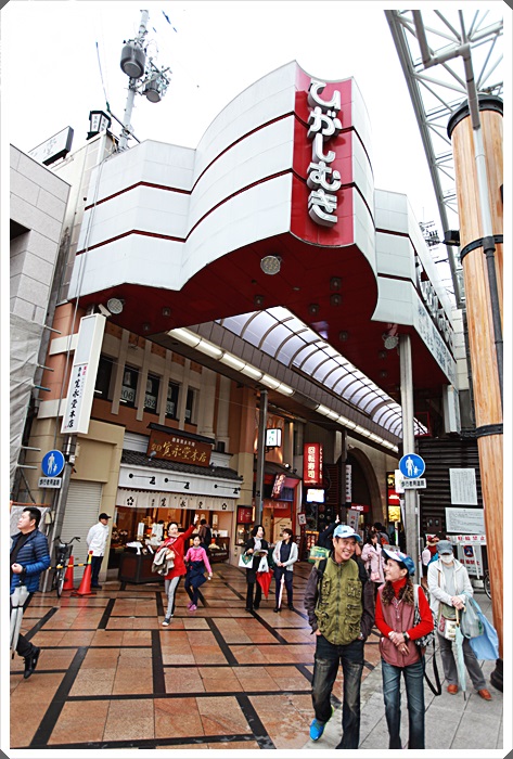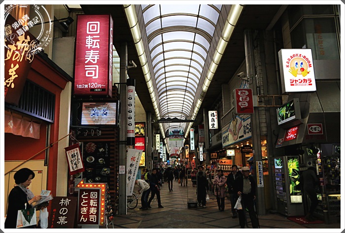 | 一出近鐵站就可以看到商店街了,奈良近鐵站的商店街算是相當的熱鬧,即使當天下著小雨卻依然人潮洶湧,進入商店街後就有很多吃的選擇了。 |