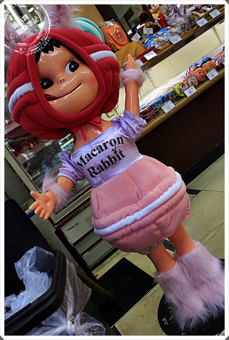 | 門外大型公仔超可愛的,我們經過的時候是先發現他才注意這邊有不二家,但是這公仔戴上那頭套真的是可愛到爆了。 |