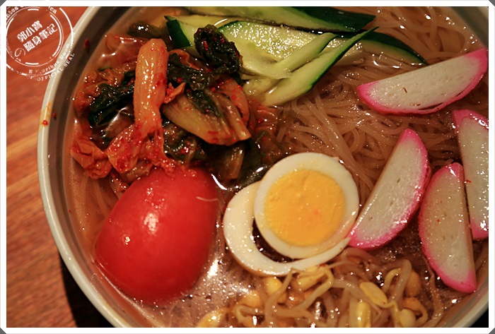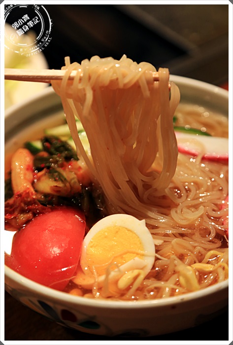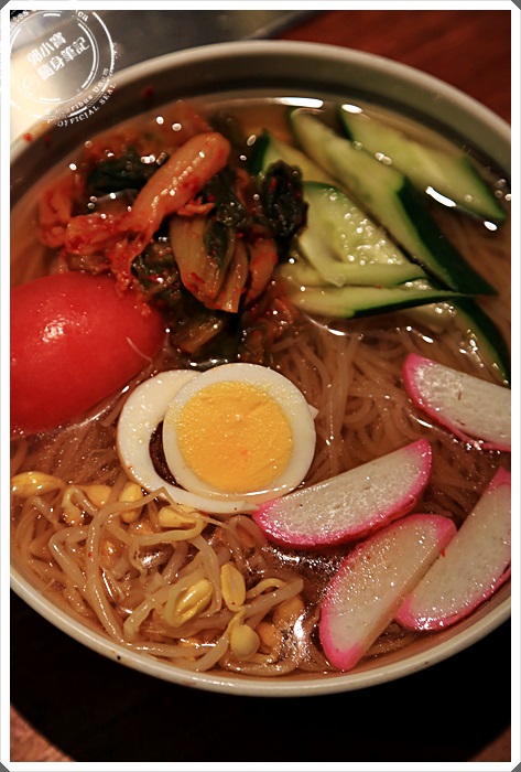 | 大部分的燒肉店都有販售韓國冷麵,我還滿喜歡吃韓國冷麵的,所以有看到的話都會點上一碗來填飽肚子,畢竟燒肉要吃到爽真的會大失血,這冷麵端上來的時候還滿過癮的,因為配料還滿多的,喝了一口湯頭真的是過癮極了,冰涼的湯頭帶點淡淡的甜味。 |
