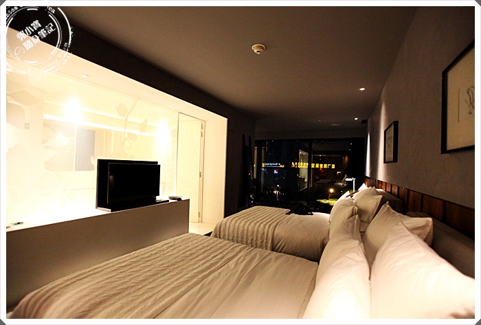 房間對面就是一整面透明玻璃,玻璃那邊就是衛浴設備了,透明玻璃內邊是有電動窗簾的,避免有時候不是情侶入住的時候產生尷尬。