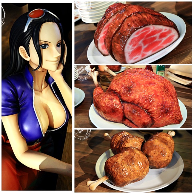 | 我看了好久,我們也幾乎一一跟這些主角們合照,做的真的是超棒的,連魯夫最喜歡的肉模行也是作的超逼真的啦,看起來就很好吃的感覺,肚子都餓了起來。 |