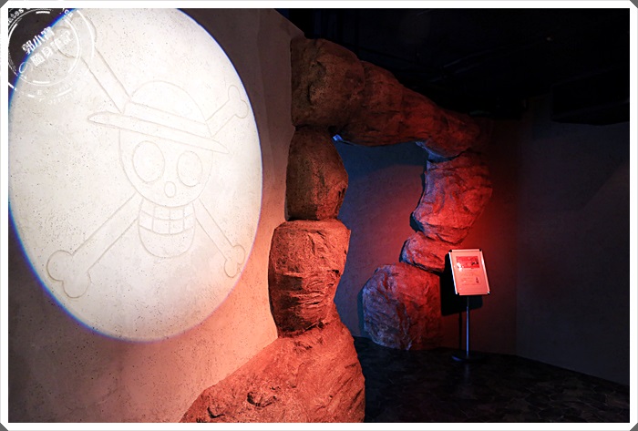 | 入口處布置的山洞入口一樣,透露的詭異的氛圍,大大的草帽海賊團的光影在白牆上。 |